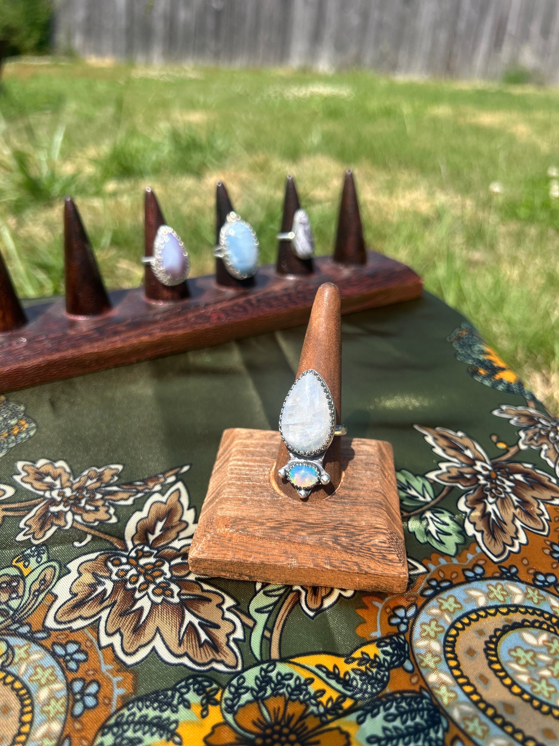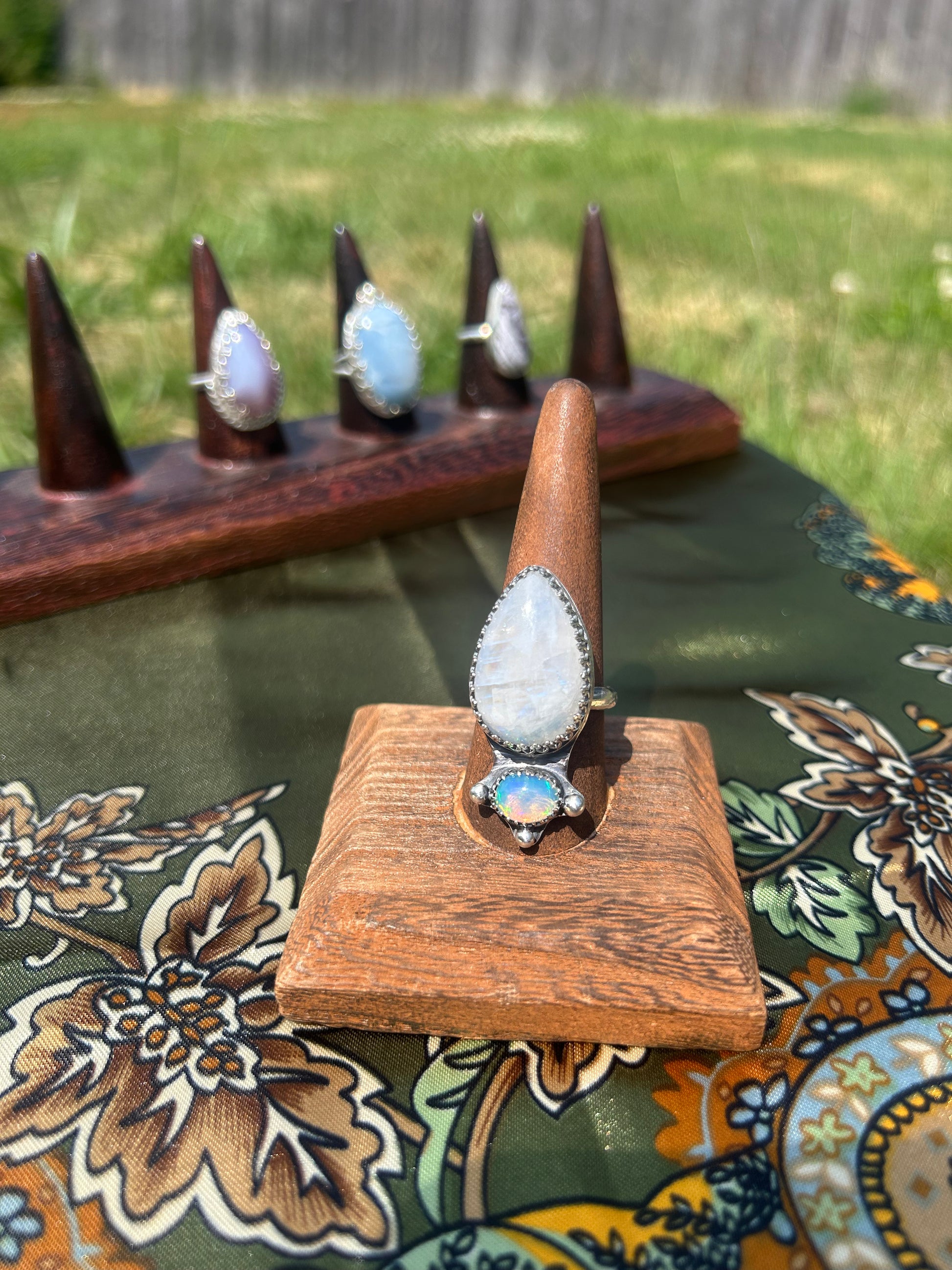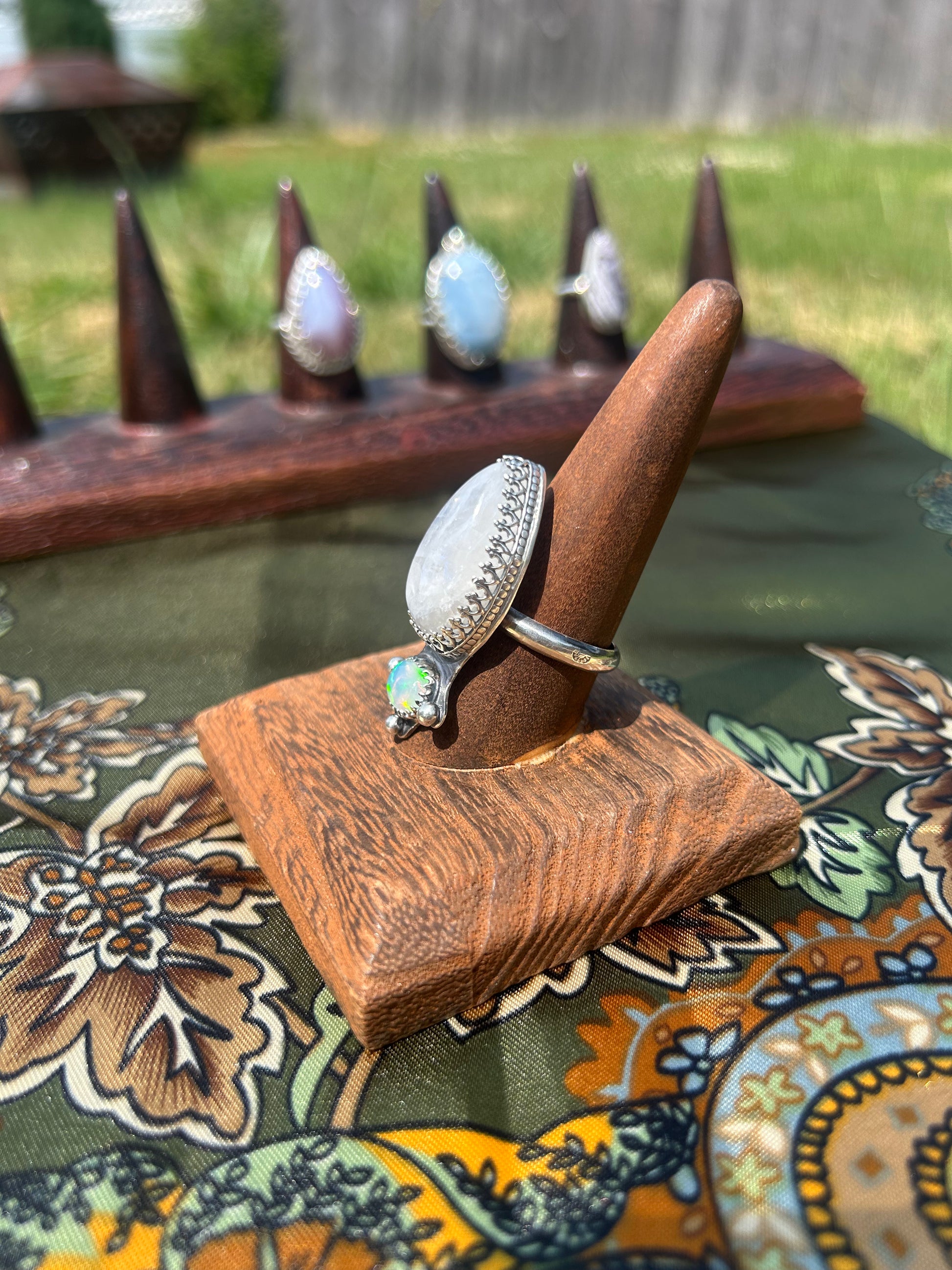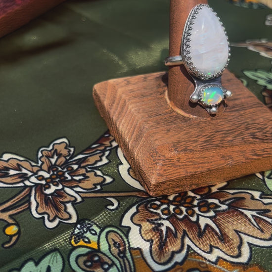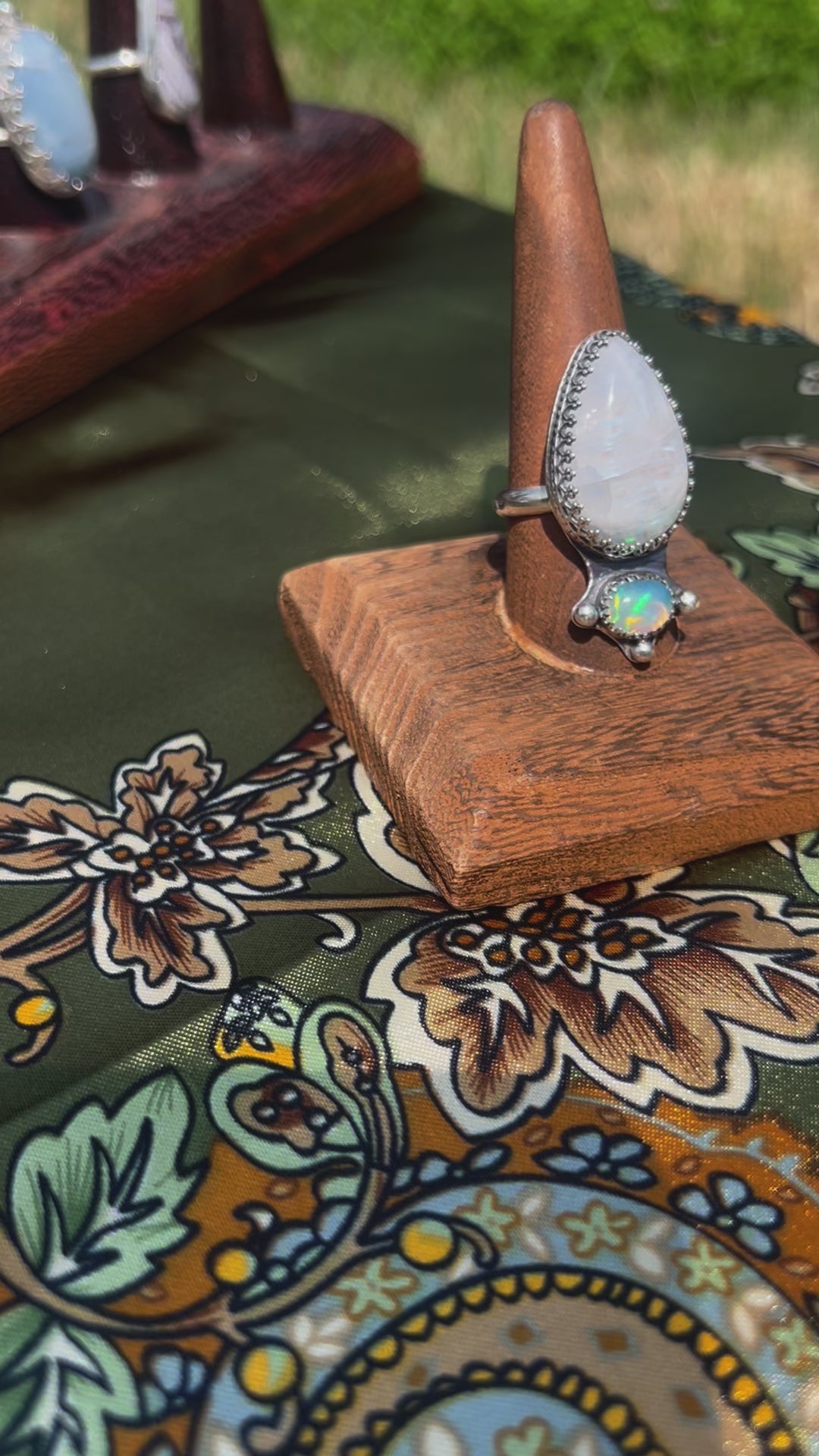 This whimsical Moonstone and Opal Ring, sized 9.5-9.75, is a handmade treasure crafted from sterling silver. Its hand-stamped band adds a charming, personal touch, while the glowing moonstone and shimmering opal create a dreamy, magical sparkle that captures the imagination. Perfect for those who adore unique, enchanting jewelry.