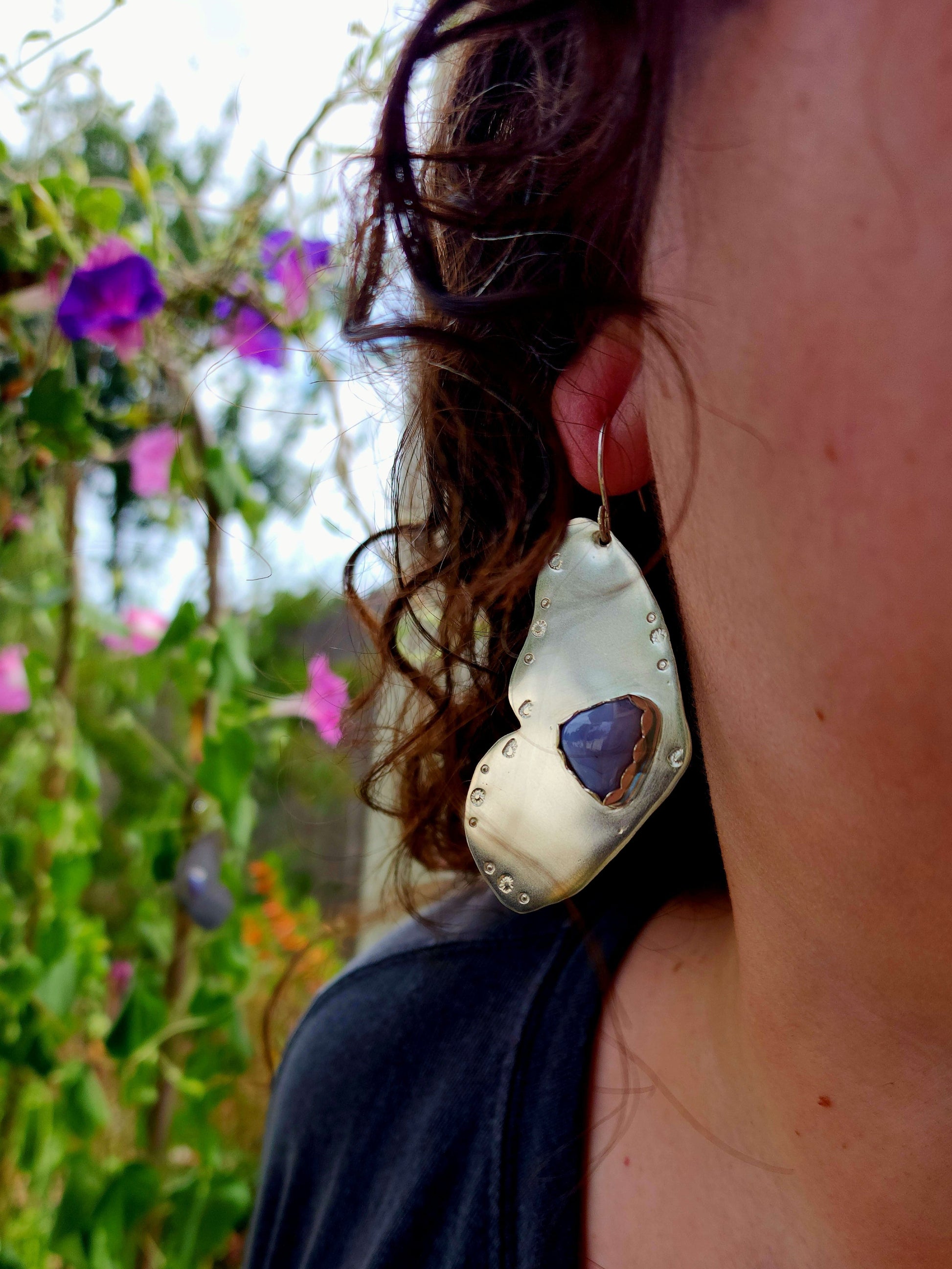 These Purple Agate Butterfly Earrings feature banded purple stones from the South Santiam River wrapped with 999 fine silver bezels paired with hand-stamped sterling silver butterfly wings. Handmade with care, they add a whimsical touch of natural beauty and charm to your everyday style.