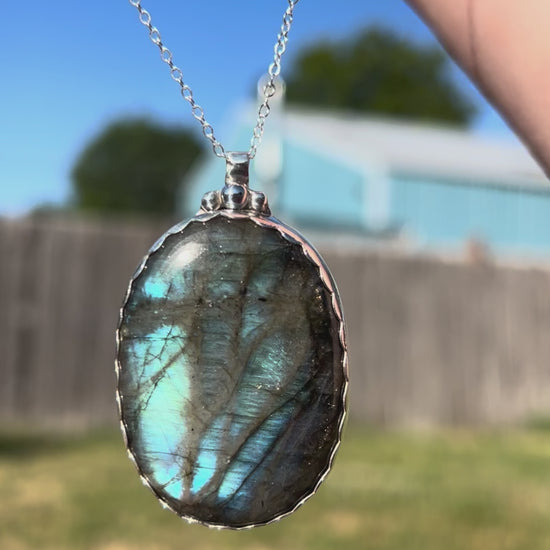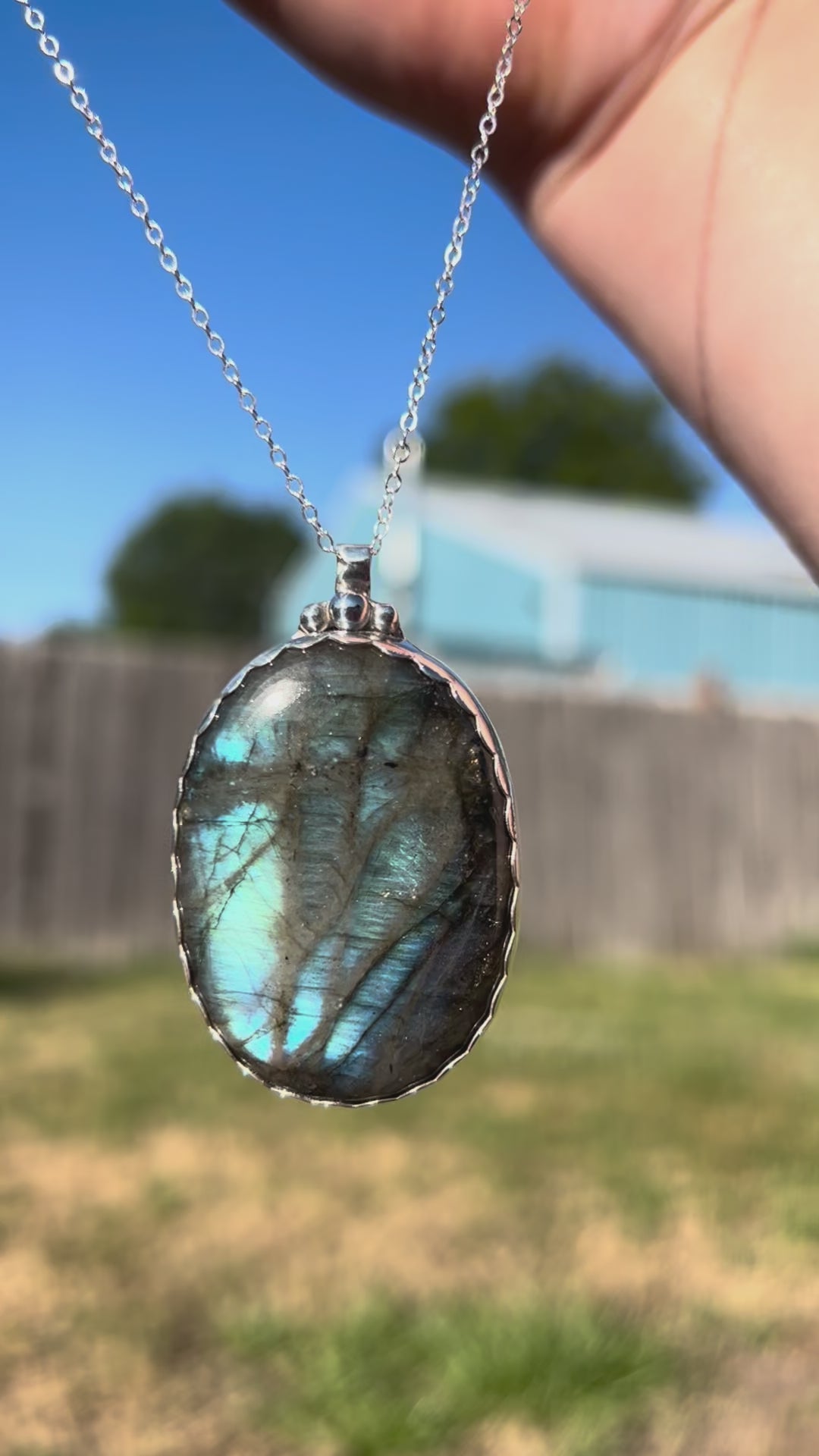 925 and 999 silver pendant featuring a labradorite stone and sterling silver chain.